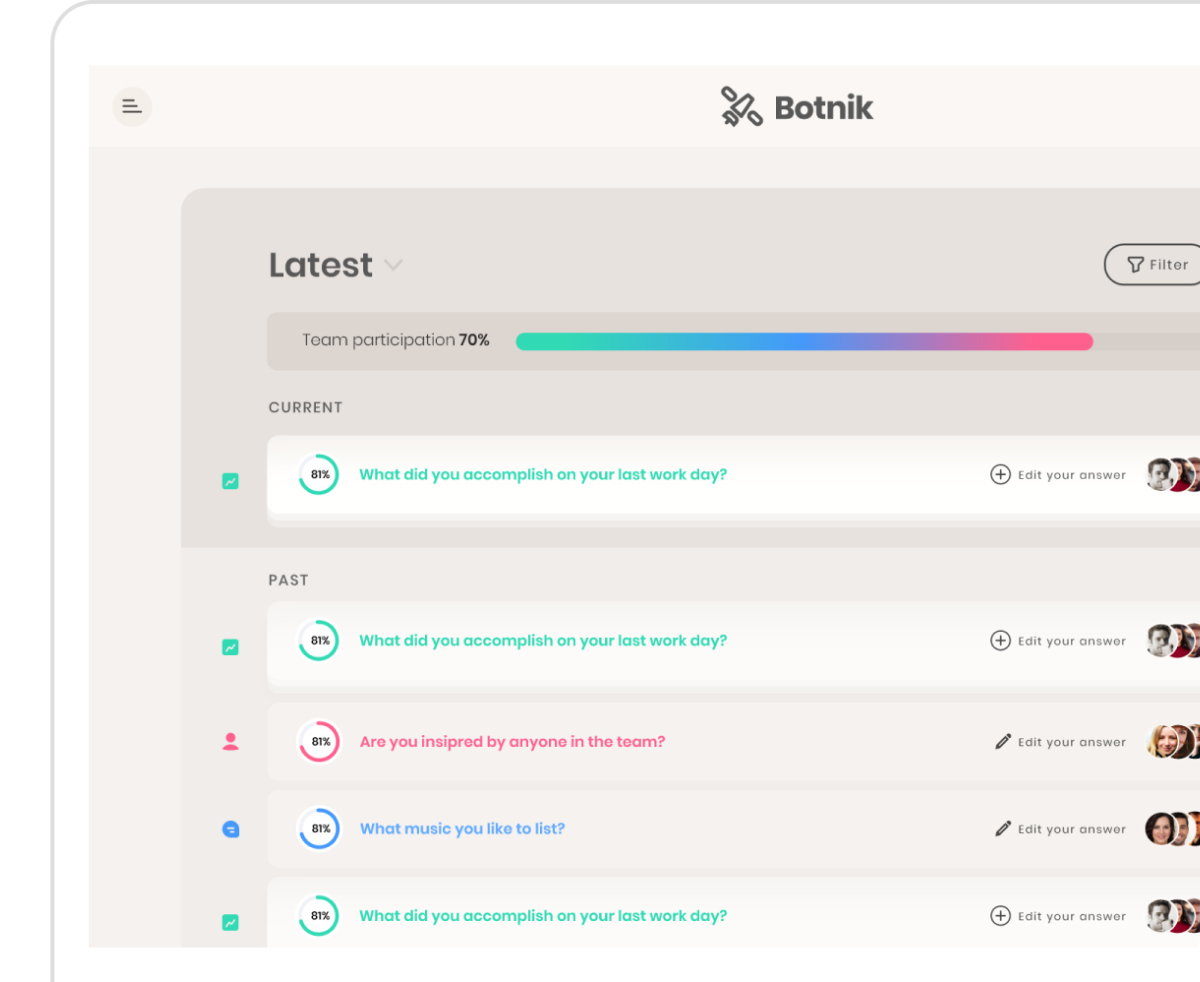 Botnik is a team-building app designed to foster empathy, transparency, and productivity within teams of any size.